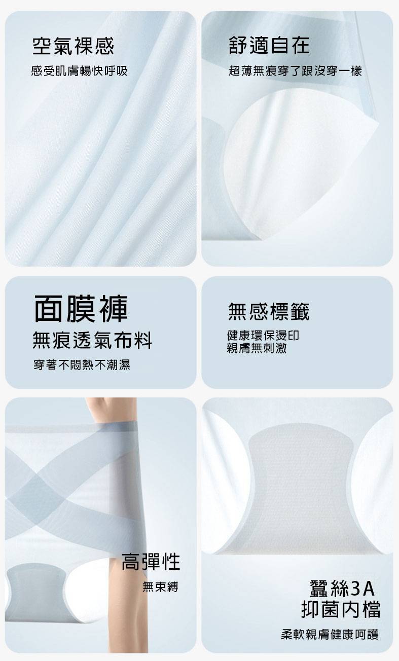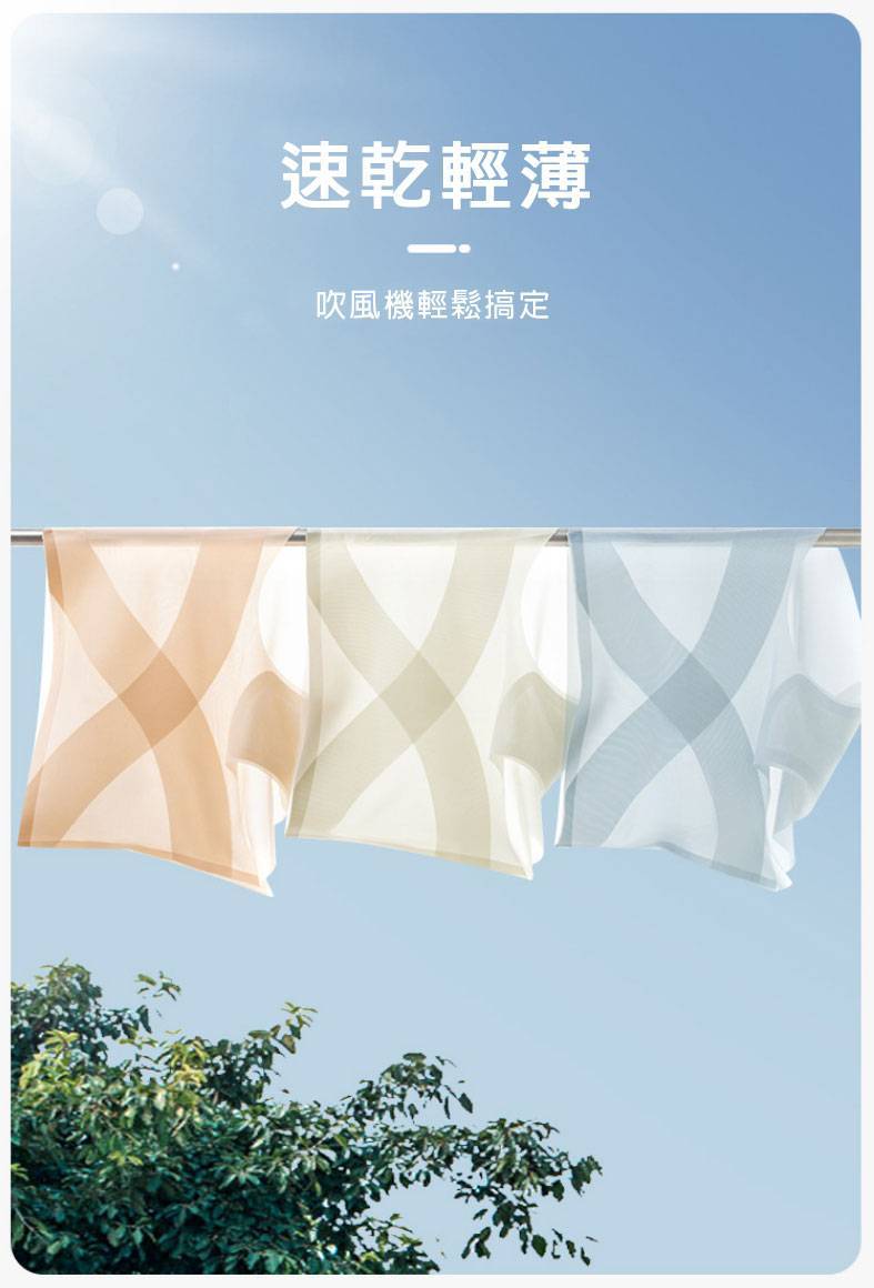 20分鐘前夏季就是要輕薄,要透氣,要涼快! X冰繃帶面膜内褲,厚度只有0.1毫米,穿上感覺跟沒穿一樣,冰冰涼涼,還有收腹效果! 吸潺排汗,一分鐘快乾,讓您乾爽一整天! - 輕薄透氣 收腹顯瘦 6入組NT$998 均價166